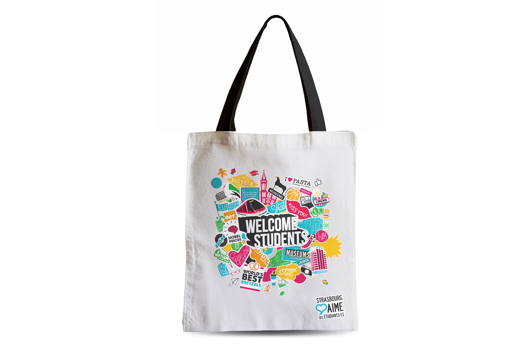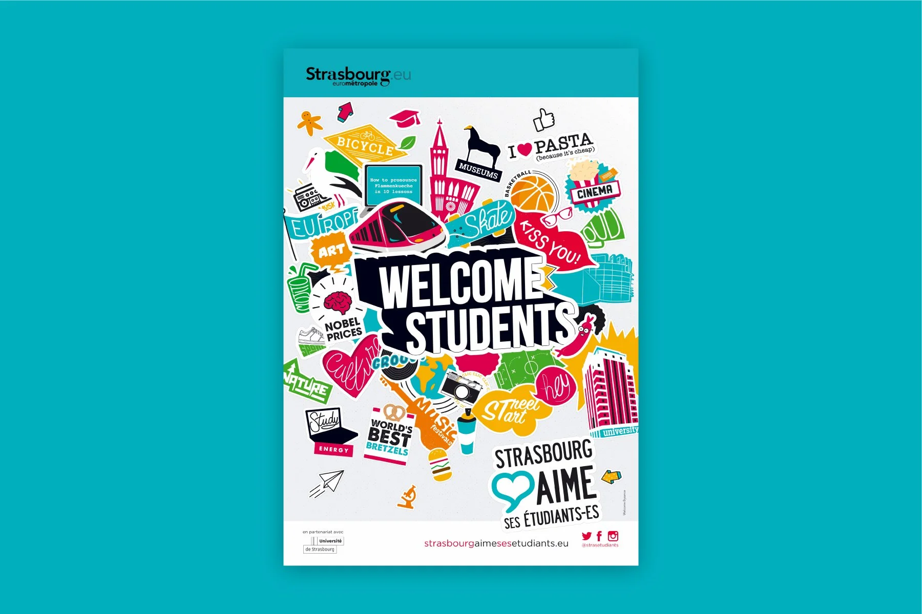 Strasbourg aime ses étudiantsCette affiche a été conçue pour souhaiter la bienvenue à Strasbourg aux étudiants de l'année 2018-2019.Fait en collaboration avec WelcomeByzance.